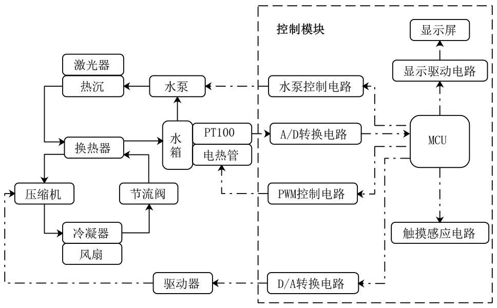 Q420/Q580系列高精度激光冷水機中,對溫度的控制是通過對蒸氣壓縮制冷系統的變頻控制和電加熱管的調節來進行的,兩者互補工作,實現水溫的精準控制。由于激光器的工作并不是穩定的,且環境因素的不確定性對制冷系統的影響很大,系統的結構和參數必須依靠經驗和現場調試來確定,因此無法用一個精確的數學模型來控制系統的工作。PID算法簡單、魯棒性好、可靠性高,是最適合本系統的控制策略之一,它根據系統的誤差,計算出比例、積分、微分控制量來調節系統的工作。由于PID的上述優點,使得Q420/Q580系列冷水機控制系統的響應速度快,控制精度高,而不需要過于加大水箱以利用水的熱容來實現溫度的穩定,這也是該冷水機能夠實現小型化的保障之一。