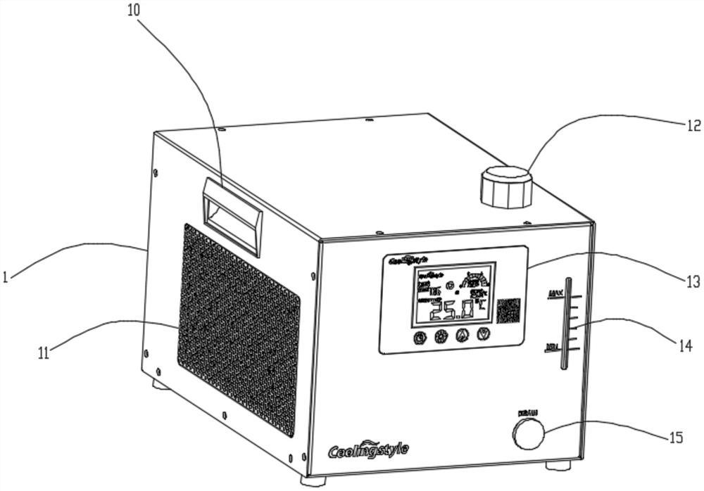 摘要: 本實用新型公開了一種微型高精度激光冷水機,包括外部殼體及內部設置的制冷循環組件、水循環組件和控制電路,制冷循環組件包括壓縮機、冷凝器、干燥過濾器、毛細銅管和換熱器。本實用新型采用高效的微型壓縮機、冷凝器和對沖式板式換熱器,保證了熱量充分轉換、大幅度提高了系統的制冷效率。