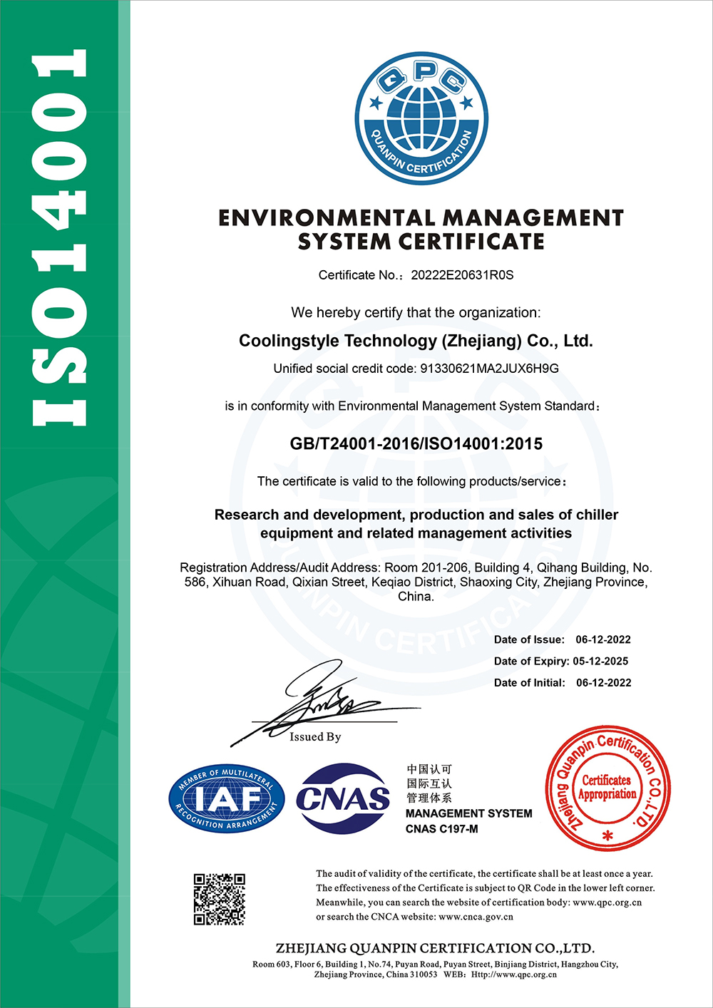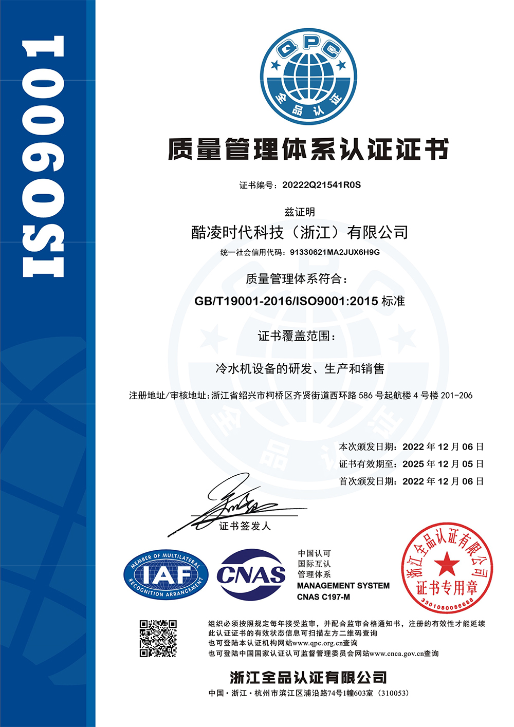 證書覆蓋范圍:冷水機設備的研發、生產和銷售