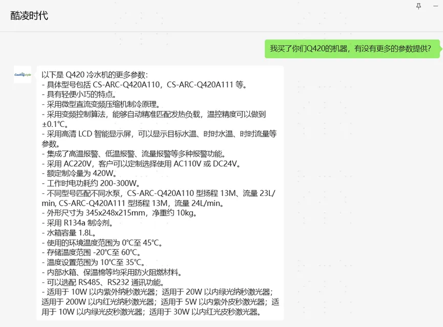 客服智能體是我們酷凌時代公司擁抱AI的起點,我們嵌入了大量公司現(xiàn)有的產(chǎn)品數(shù)據(jù)資料,用戶可以直接向智能助手詢問相關(guān)產(chǎn)品參數(shù)和售后疑問。隨著我們知識庫的不斷豐富和模型訓(xùn)練的推進,智能助手將給您帶來越來越好的體驗!